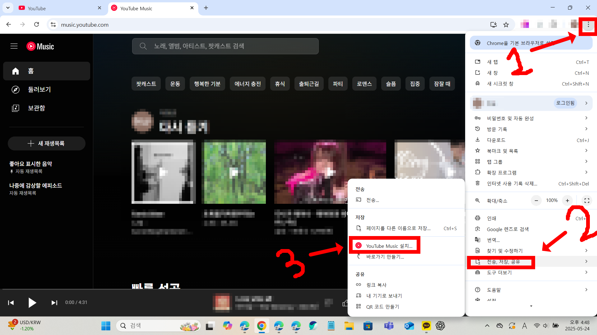 - ‘설치(Install YouTube Music)’ 메뉴 선택