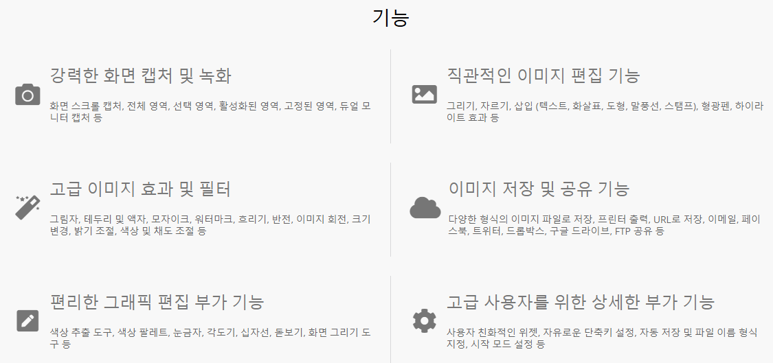 - 자동 영역 인식, 마우스 커서 포함 캡처 등