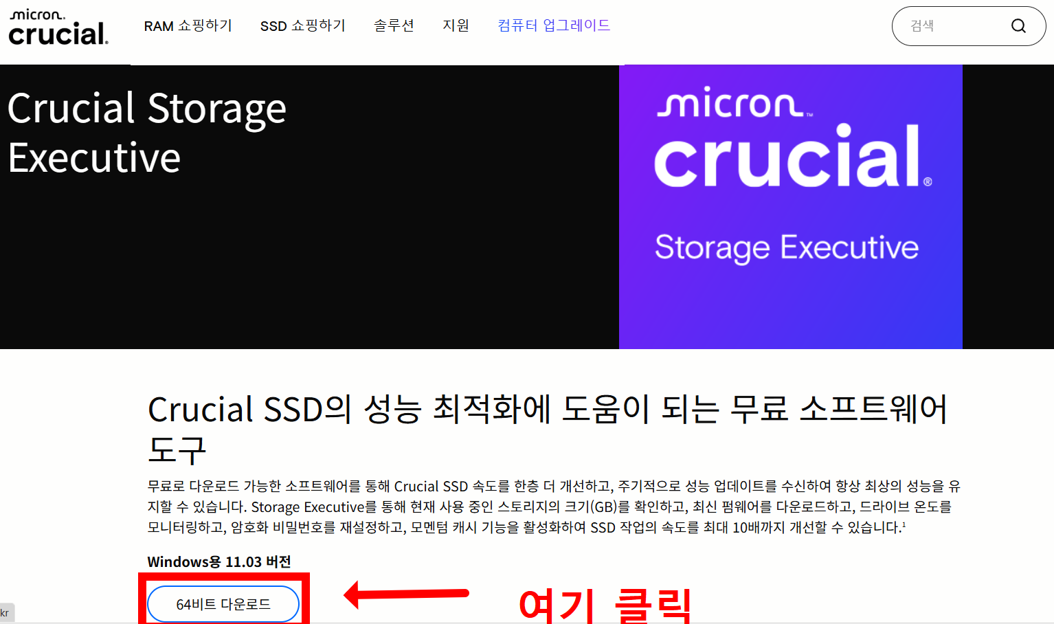 - 상단 메뉴 중 지원 → Storage Executive 다운로드로 이동합니다.